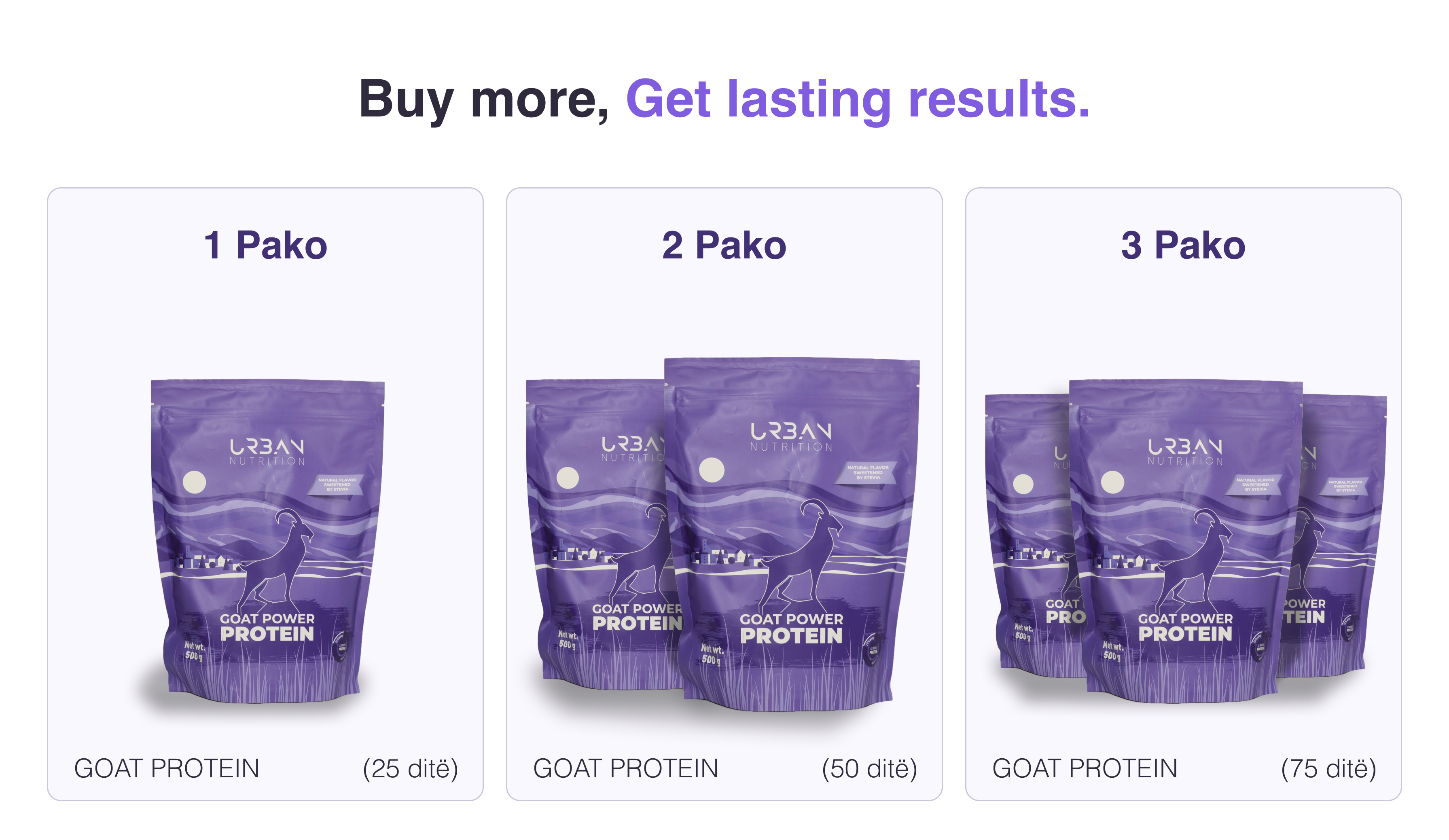 • 25 ditë përdorim, bazuar në dozën e rekomanduar prej 20 gramësh për shërbim